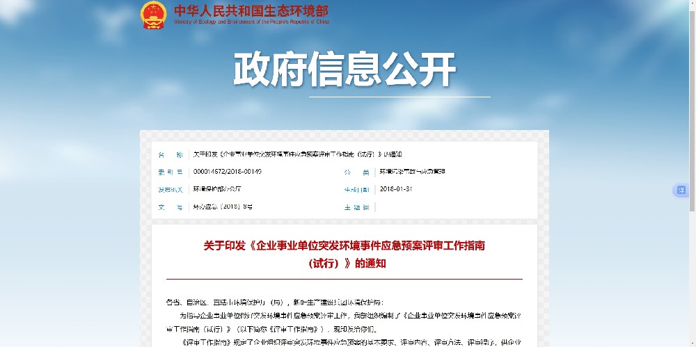 名称关于印发《企业事业单位突发环境事件应急预案评审工作指南(试行)》的通知索 引 号000014672/2018-001···